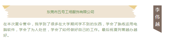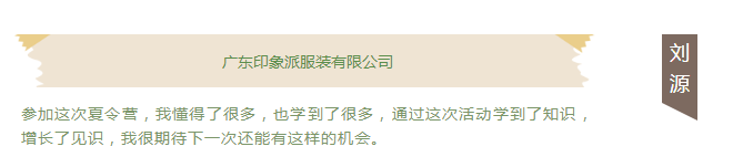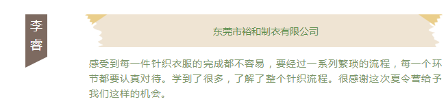 第一届大朗毛织夏令营已圆满结束!在结营的时刻,东莞市毛织服装设计师协会陈敬东会长为夏令营的选手颁发了“优秀营员”的证书,期望准设计师们在以后的设计道路上能继续深研毛织、感受毛织设计的无限创造和乐趣。感谢东莞市裕和制衣有限公司、广东印象派服装有限公司、东莞市安盛服饰有限公司、东莞市玛赛妮服饰有限公司和东莞市五号工场服饰有限公司对选手们的用心指导,对毛织夏令营的支持,对毛织设计的贡献力量!