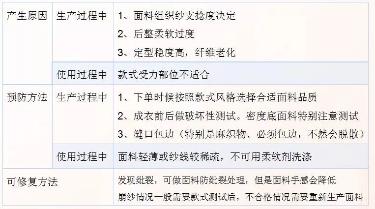 三、面料纰裂及崩纱